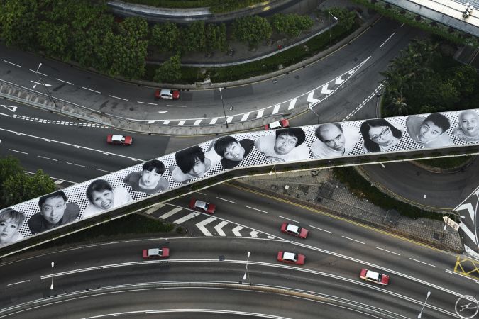 JR unveiled his monolithic 16 portrait installation- part of his global ‘Inside Out’ project- across the Connaught Rd bridge on Tuesday simultaneously with his solo exhibition opening. The gallery was heaving with fans all waiting in line patiently for their chance to be snapped at the in-gallery photo booth for their Inside Out portrait. Now…where to paste them….?