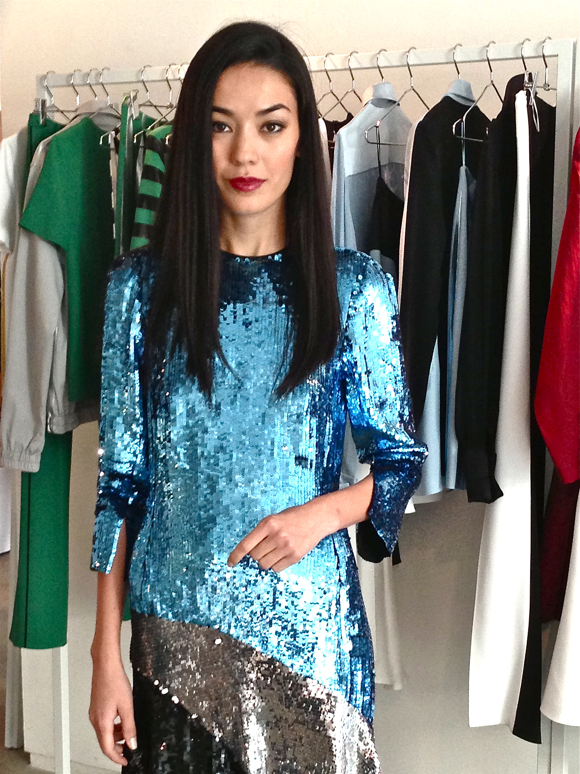 Jonathan Saunders collection moved beyond graphic prints into an explosive arrangement of ombre jewel tones and sequins with a 70s retro feel.
