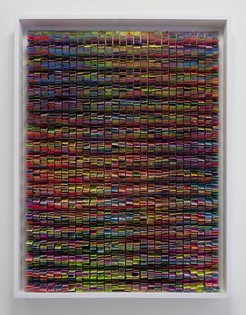 Turn right as you enter Galerie Perrotin‘s Hong Kong space and your eyes will immediately be drawn to two kaleidoscopic shower curtain-like installations suspended from the ceiling. A collection of painted river stones lie in a group nearby, bearing what look like colourful waterlines. Another cluster of river stones lies in the adjacent room. Covered in fluoro hand-knotted netting they look like they’ve been fished out of the water, mistaken for a crustacean catch. Filling the surrounding wall space is a series of ten brightly coloured ink on paper ‘fringed drawings’. All together the effect is that of a multi-media abstract ‘schizophrenic’ landscape, fragmented and dispersed throughout the gallery space.