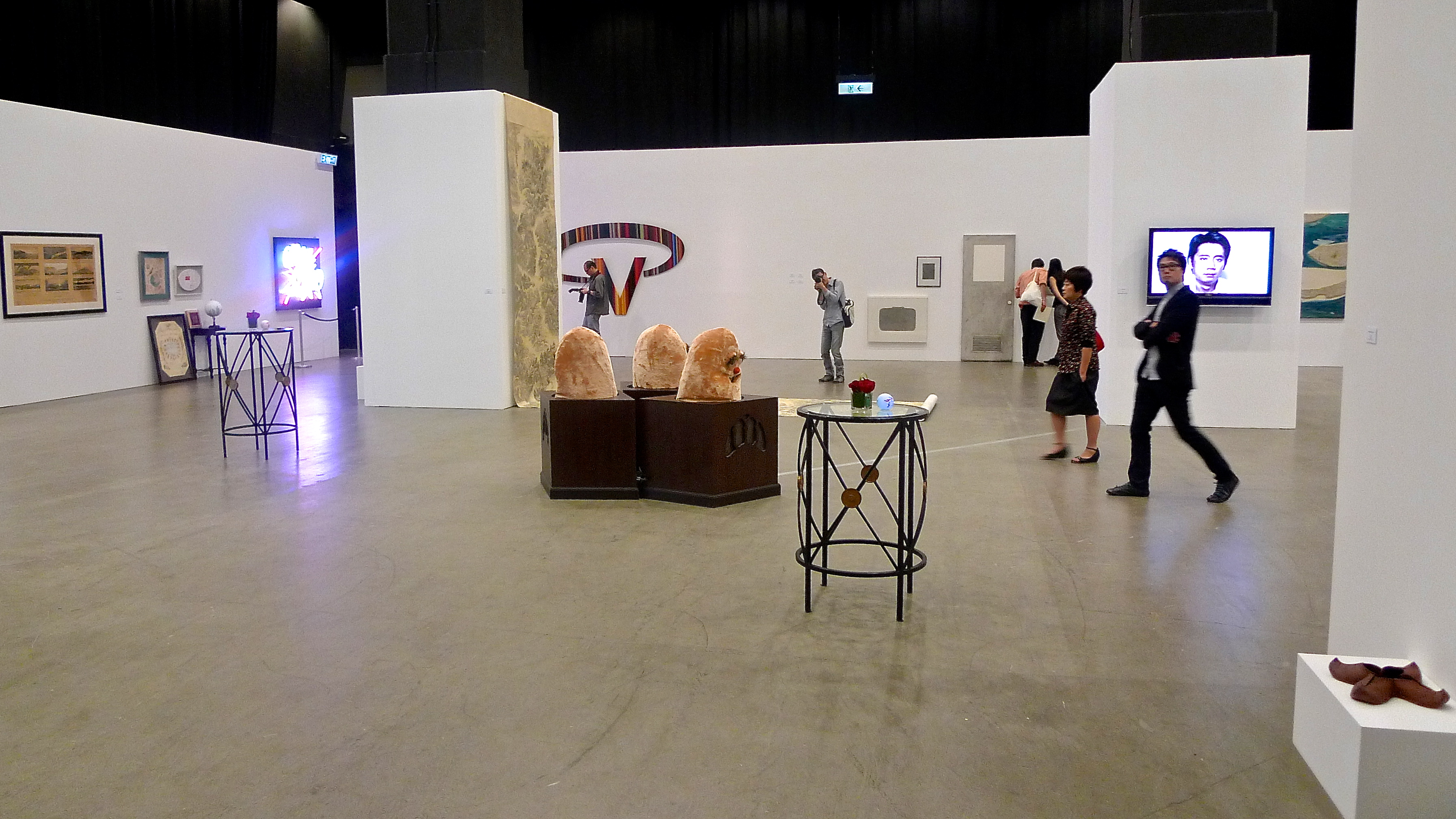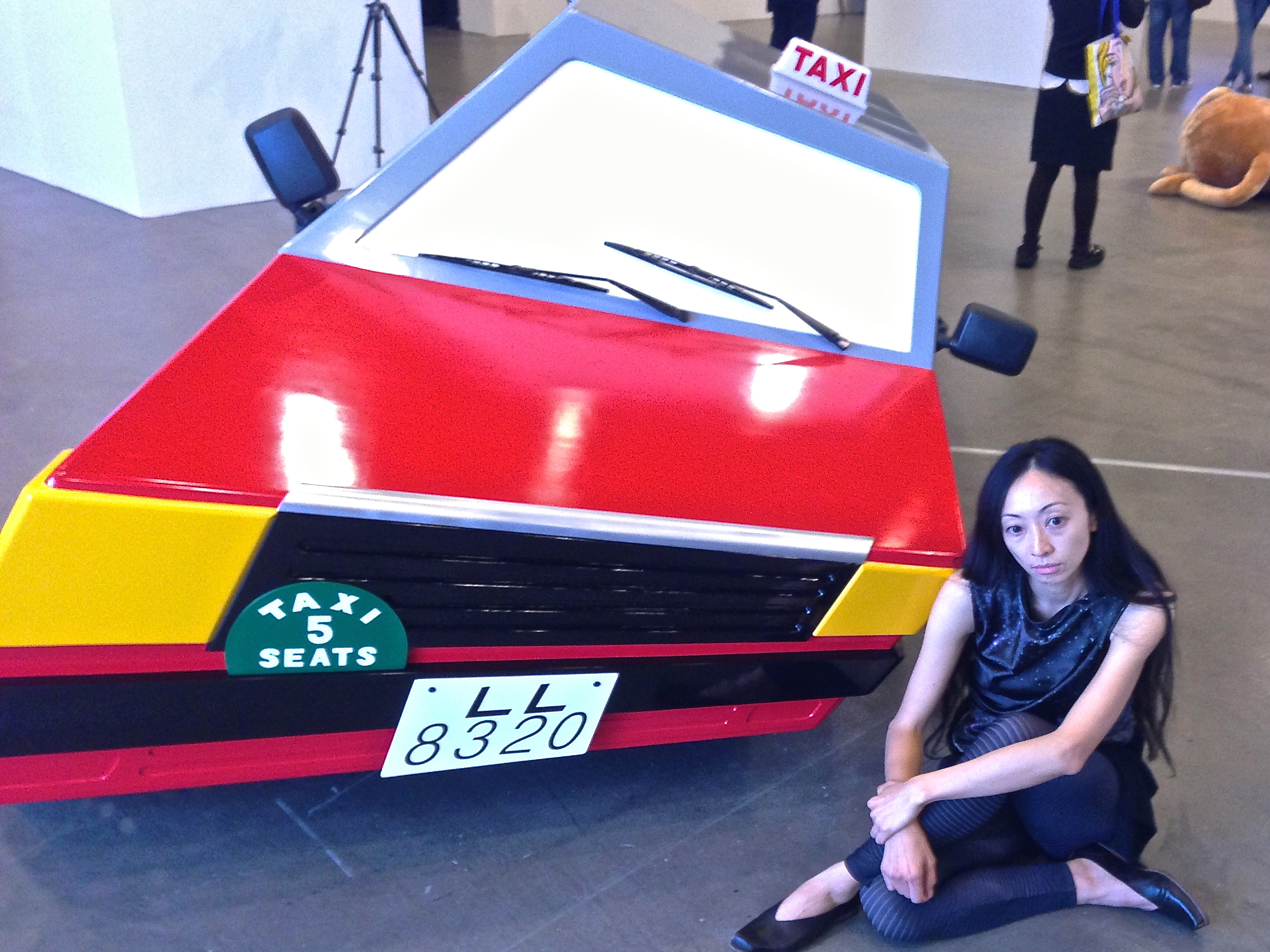 The only common thread tying the works together is geography. But then, the point of the show is to provide a general introduction to the Hong Kong contemporary art landscape, so to speak. It is an eclectic scrapbook of Hong Kong artists, with works reflecting their experiences and their response to the city, its history, society, and politics. There are works drawing on classic Chinese ink painting, such as Leung Kui Ting‘s unfurling ink landscapes; traditional craft, such as Kum Chi Keung‘s bamboo birdcage; film, as seen in Chow Chun Fai‘s ‘subtitled’ reproduced film-still paintings, which deal with Hong Kong’s culture and identity; and the urban. But the show is not without humour or the absurd. A life-sized distorted red Hong Kong taxi sits just ahead of the entrance, plucked from an Alice in Wonderland dream by artist Amy Cheung. Beside it, a large plush prostrate Mr Potato Head figure, LA-based Adrian Wong‘s ‘In Search of a Primordial Idiolect IV’, emits repetitive bovine moans and dialogue that resound throughout the exhibition space. Portuguese-born Joao Vasco Paiva brings the urban Hong Kong experience into the exhibition space with a kinetic sculpture of MTR turnstiles, reducing the mechanical quotidian experience of commuting on the subway to the abstract. Kingsley Ng‘s ‘Musical Loom’ echoes hauntingly and theremin-like from the other end of the exhibition space. The whole feels like a string of pieced together mini theatre sets where one can visit and get lost in a cacophony of sounds, shapes and colours.