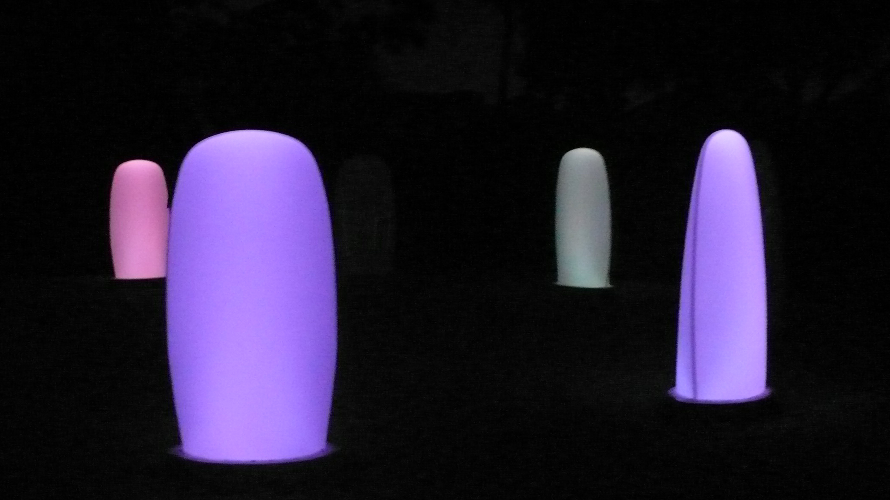 Mori is fascinated with ancient cultures and traditions, both Eastern and Western, using technology to pay homage to these often forgotten lost worlds – from Japanese Jomon culture to Stonehenge to the entire cosmos. Her celebrated work, ‘Tom Na H-Iu II’, a futuristic monolith inspired by the ancient Celts, stands sentry, a 4.5m lone glass standing stone, resembling a left-over part of a stone circle. It pulses with coloured LED light as though it is breathing, transfixing the viewer with its hypnotic rhythm. The source of the coloured light are electronic particles, neutrinos, that are emitted during the explosive death of a star, and transmitted via internet by the Super-Kamiokande observatory at the University of Tokyo’s Institute for Cosmic Ray Research in Japan.