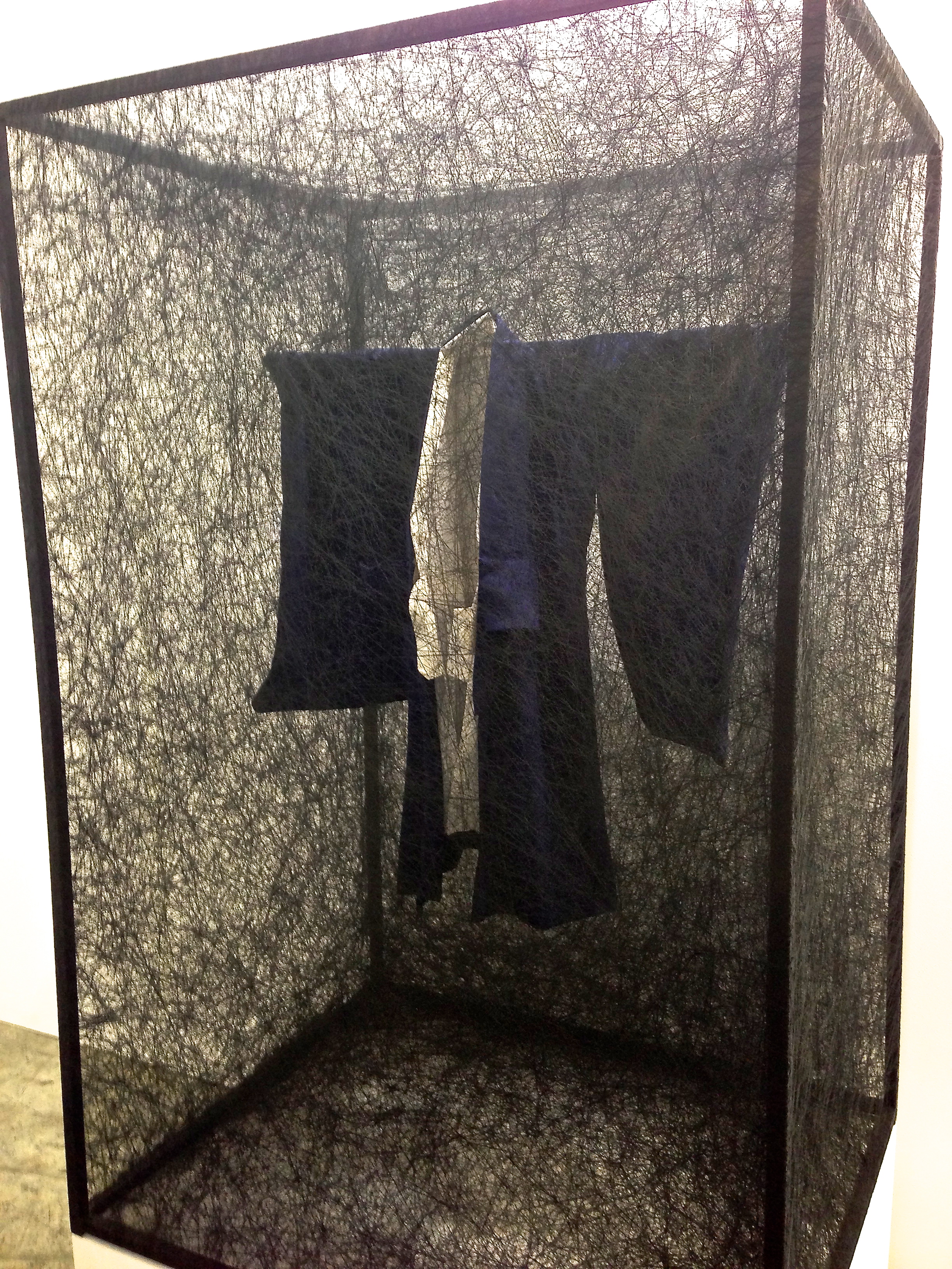 Galerie Daniel Templon presented a Miss Havisham-esque kimono suspended in web-like black threads by Japanese-born Berlin-based installation artist, Chiharu Shiota.