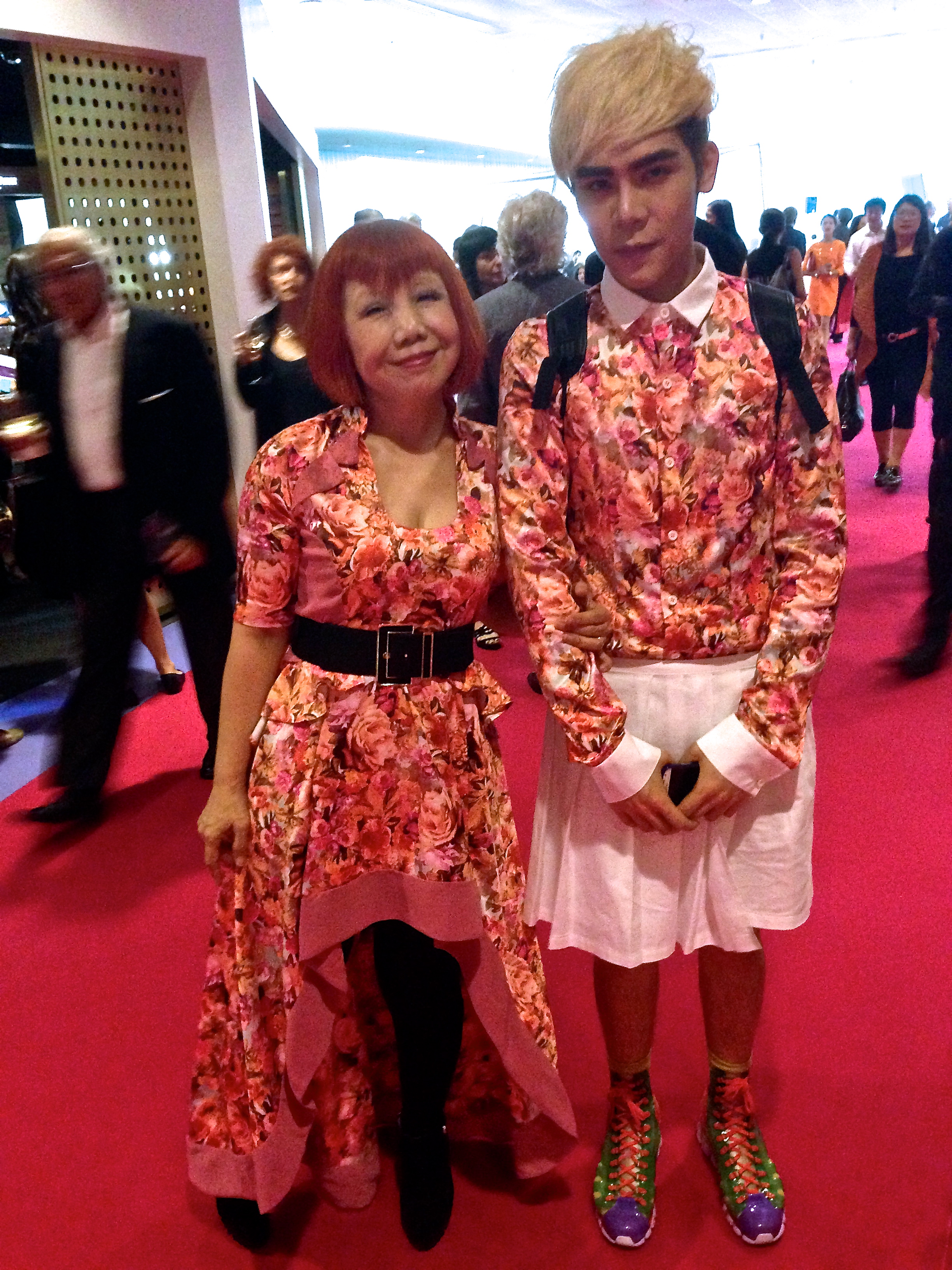 Art world fixtures Eva and Adele did not turn up to this fair but there were at least a few head-turning outfits at the first Art Basel HK. Former Director of Shanghai’s Museum of Contemporary Art, Victoria Lu, sporting a Kusama-esque red bob was spotted with designer Xiang Tseng, who was responsible for the pair’s floral concoction.