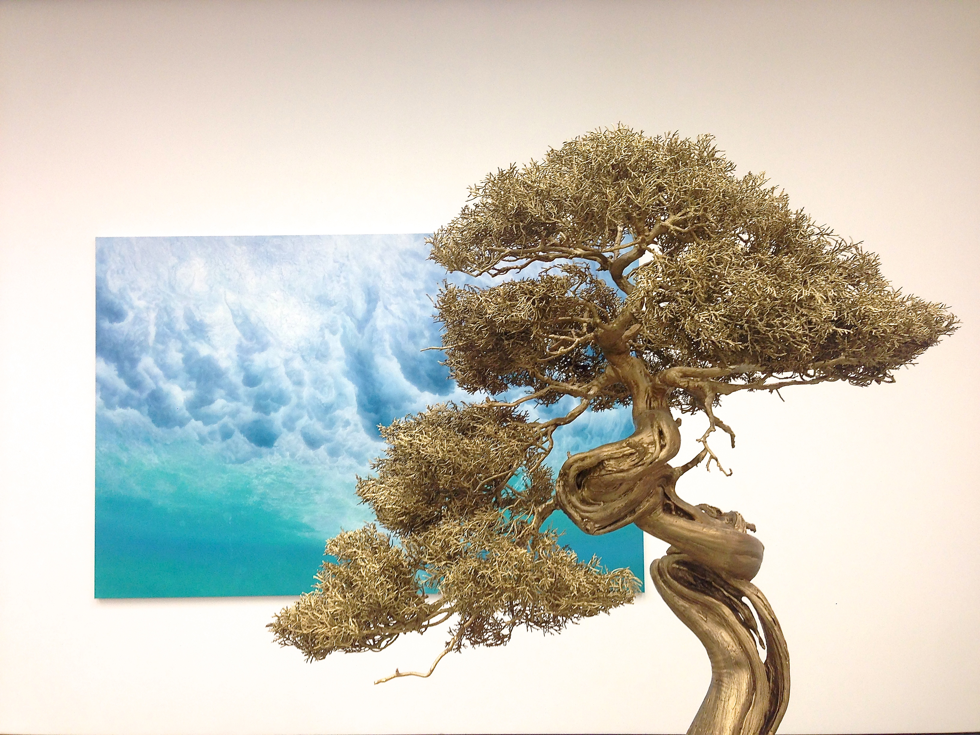 The centrepiece and namesake of the exhibition, a bronze bonsai tree, ‘Held by Desire (Chinese Juniper)’, is sculpted so meticulously and is so detailed that I initially dismissed it as a spray-painted bonsai. It isn’t. Rather, here Quinn has used the latest technologies in 3-D scanning and printing and married them with century-old artistic techniques of casting. The tree is “a microcosm of our relationship with nature,” symbolic of the exhibition’s main preoccupation with our desire to shape the universe and control it. “It’s about illusion and control of nature. That’s what bonsai is essentially, the idea that we can control the world. You take something from nature and try to mould it but ultimately it has its own will and life,” explains Quinn. Standing before the Turneresque painting of churning water, ‘Before and After Humans’, the solitary bonsai with its twisted tortured branches recalls one of Caspar David Friedrich’s haunting romantic landscapes.