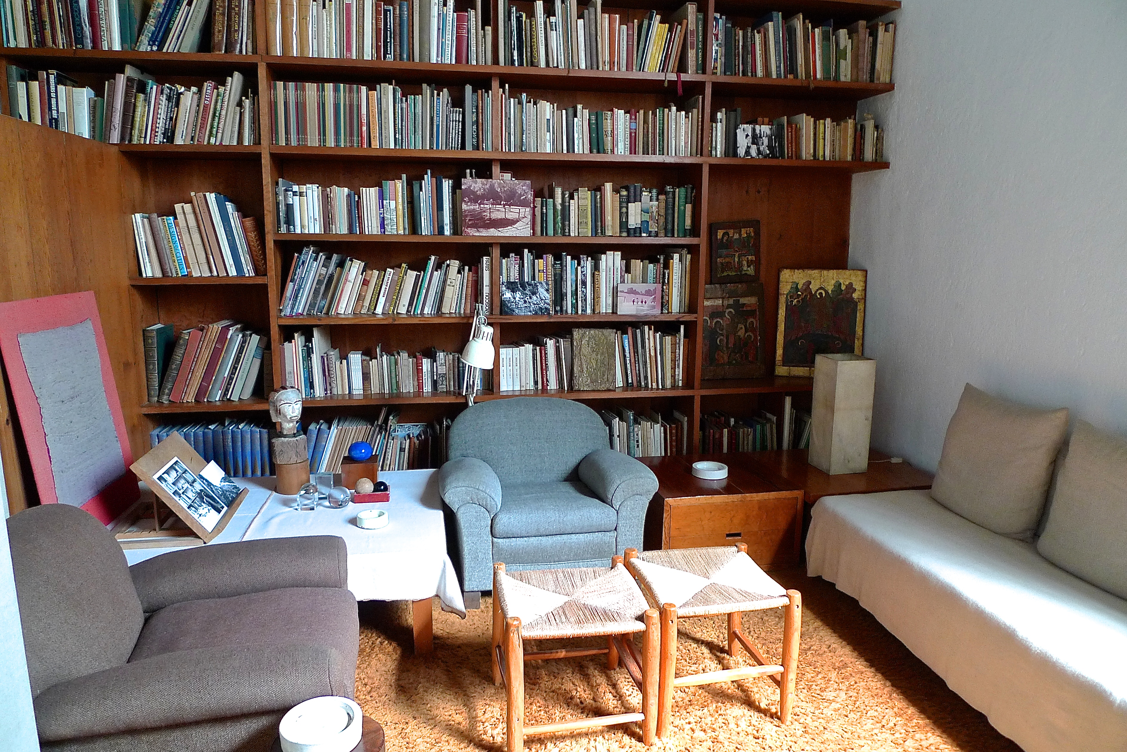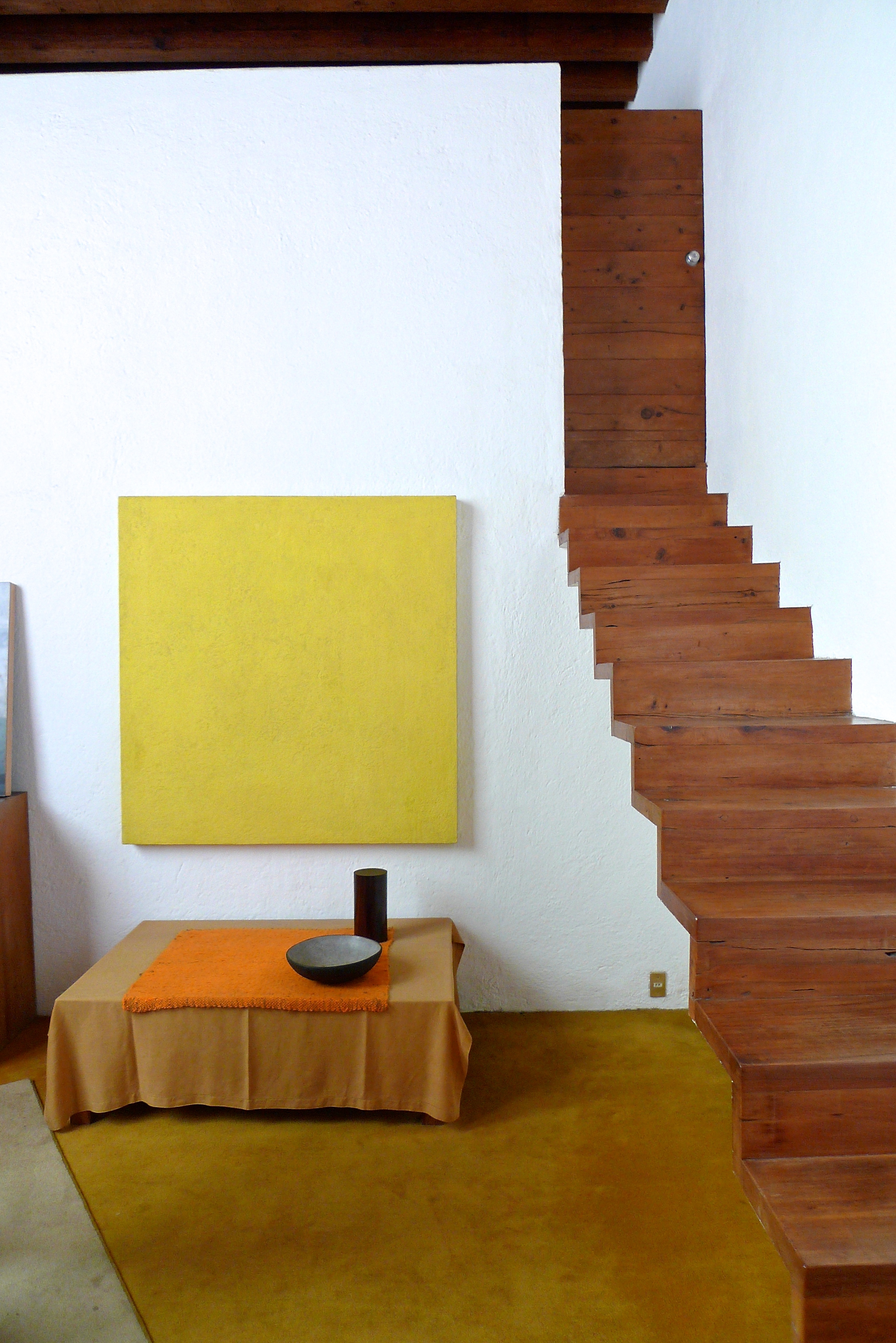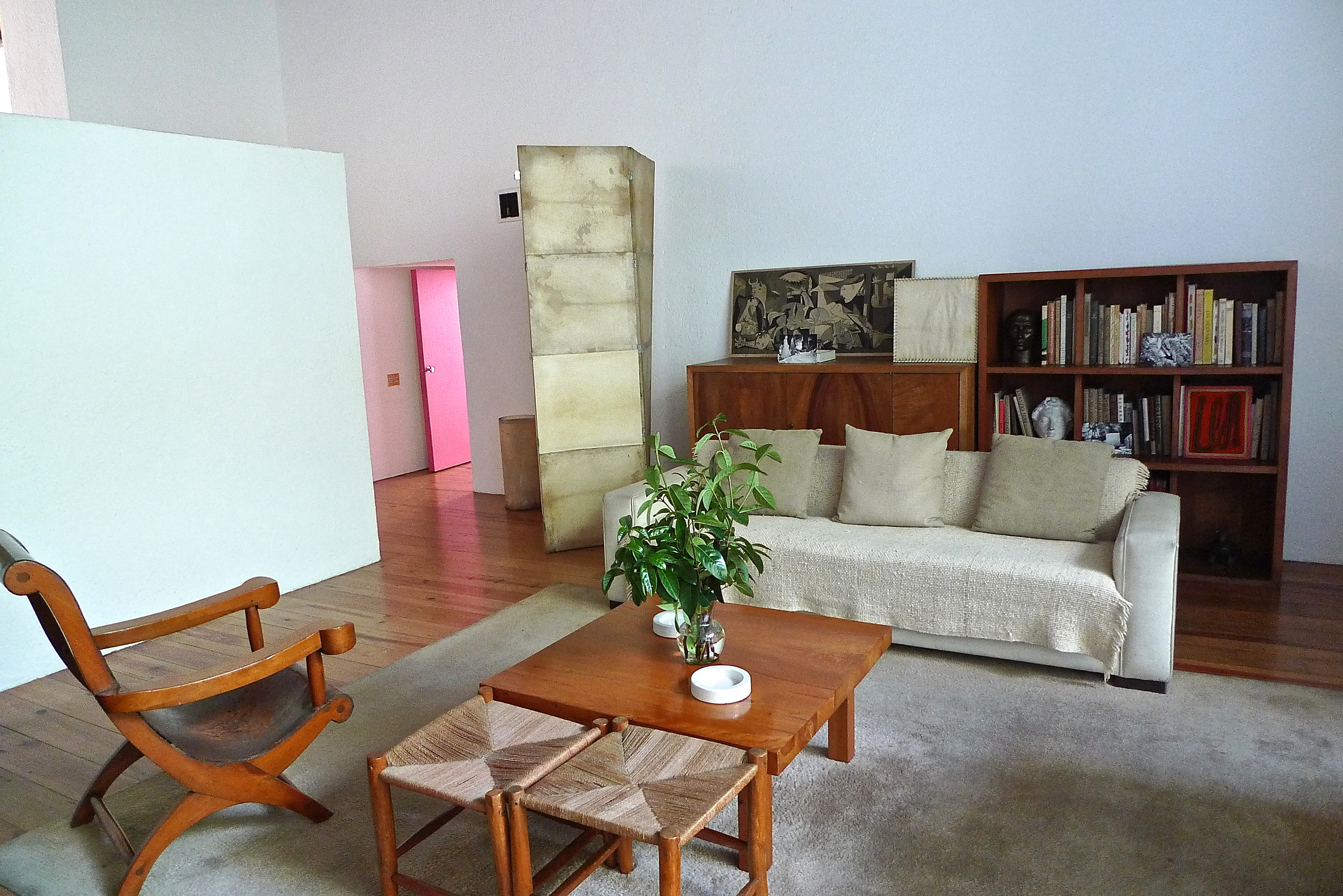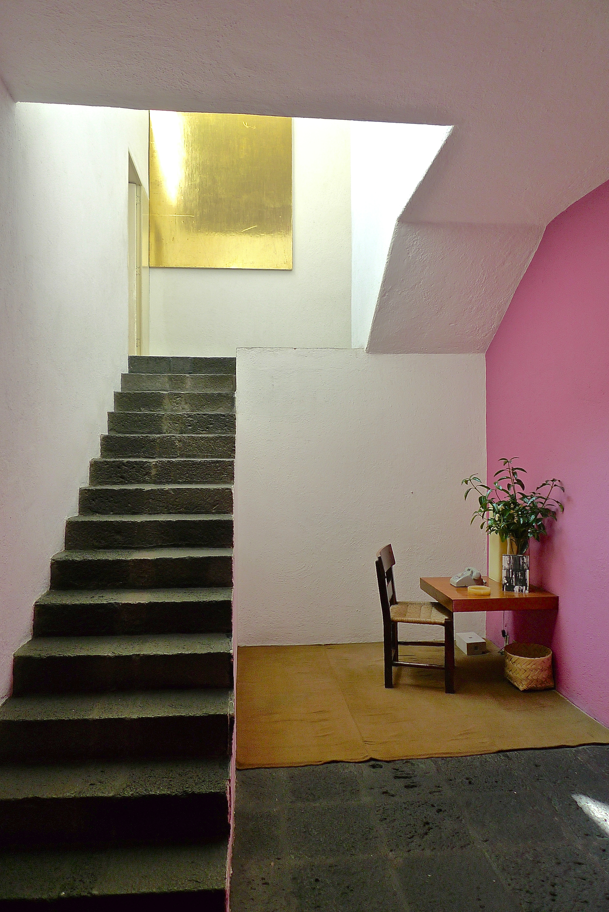 The first thing that hits you is the bubblegum pink entry hall, reflecting its warmth across every plane. It’s vibrancy and cheerfulness are disarming. Not what you expect of a modernist masterpiece. A bannister less staircase leads up to a landing where a gold leaf painting by Matthias Goeritz speckles across the surrounding stone and concrete surfaces. The din and buzz of the outside world is nowhere to be heard in this cloister of a home, but the play of natural light across objects and surfaces in the house and the colours on the wall creates drama and atmosphere in the rooms. It is no wonder that after visiting it, English architect John Pawson called it, “a place of theatre, quiet theater, but no less dramatic for that.”