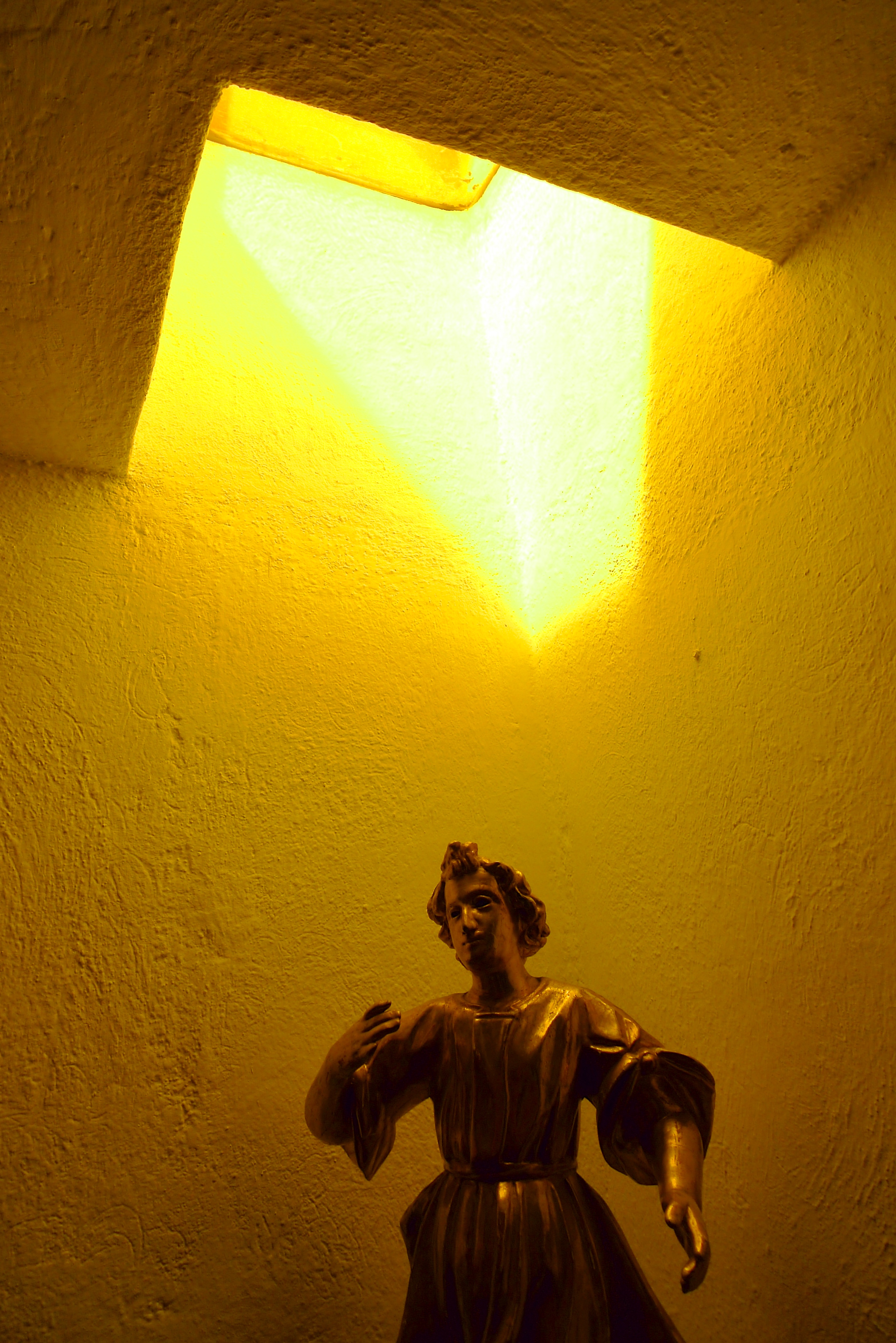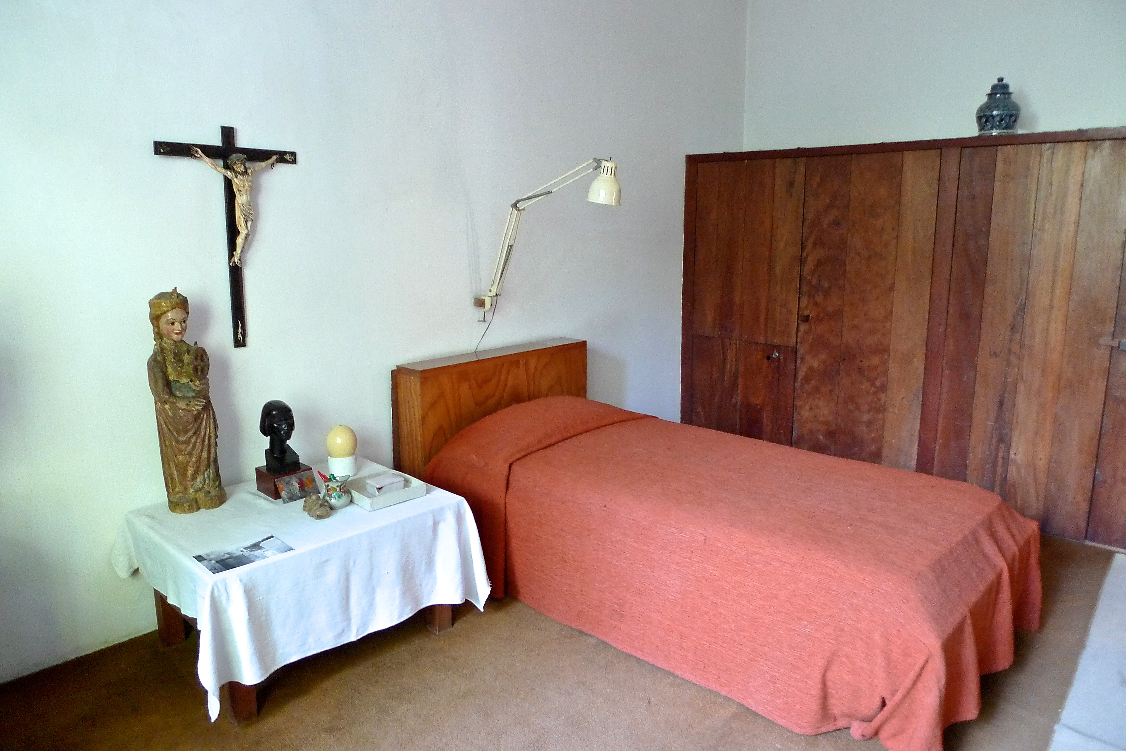 Because this was Barragán’s private residence, it reflects much of the architect’s personality, and is infused with memory and experience. A pared back and severe monastic aesthetic in the furniture and architectural design is evident throughout, an influence of his Franciscan upbringing. Religious icons and crucifixes break up the flat planes of colour across the walls in the bedrooms and dressing rooms. A golden religious sculpture set against a bright yellow wall is brilliantly illuminated from an overhead yellow skylight. The result is a halo of golden light that would inspire the envy of the most dedicated lighting designer.