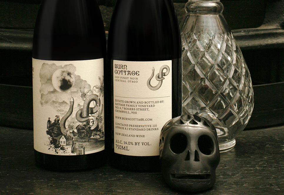 Also by Mash Design, the gothic-inspired imagery that adorns labels for biodynamic New Zealand vineyard Burn Cottage reflects both the aesthetic sensibility and philosophy of the vineyard’s owners. The labels draw on the fairy tale The Green Snake and the Beautiful Lily (published 1795) by German writer and poet Johann Wolfgang von Goethe, which explores how the life of the senses and the aspirations of the human can meet. The story, it is said, informed the work of Austrian philosopher Rudolf Steiner, who was an early advocate of biodynamic and sustainable agriculture. Steiner’s convictions, in turn, have influenced Burn Cottage’s approach to winemaking.