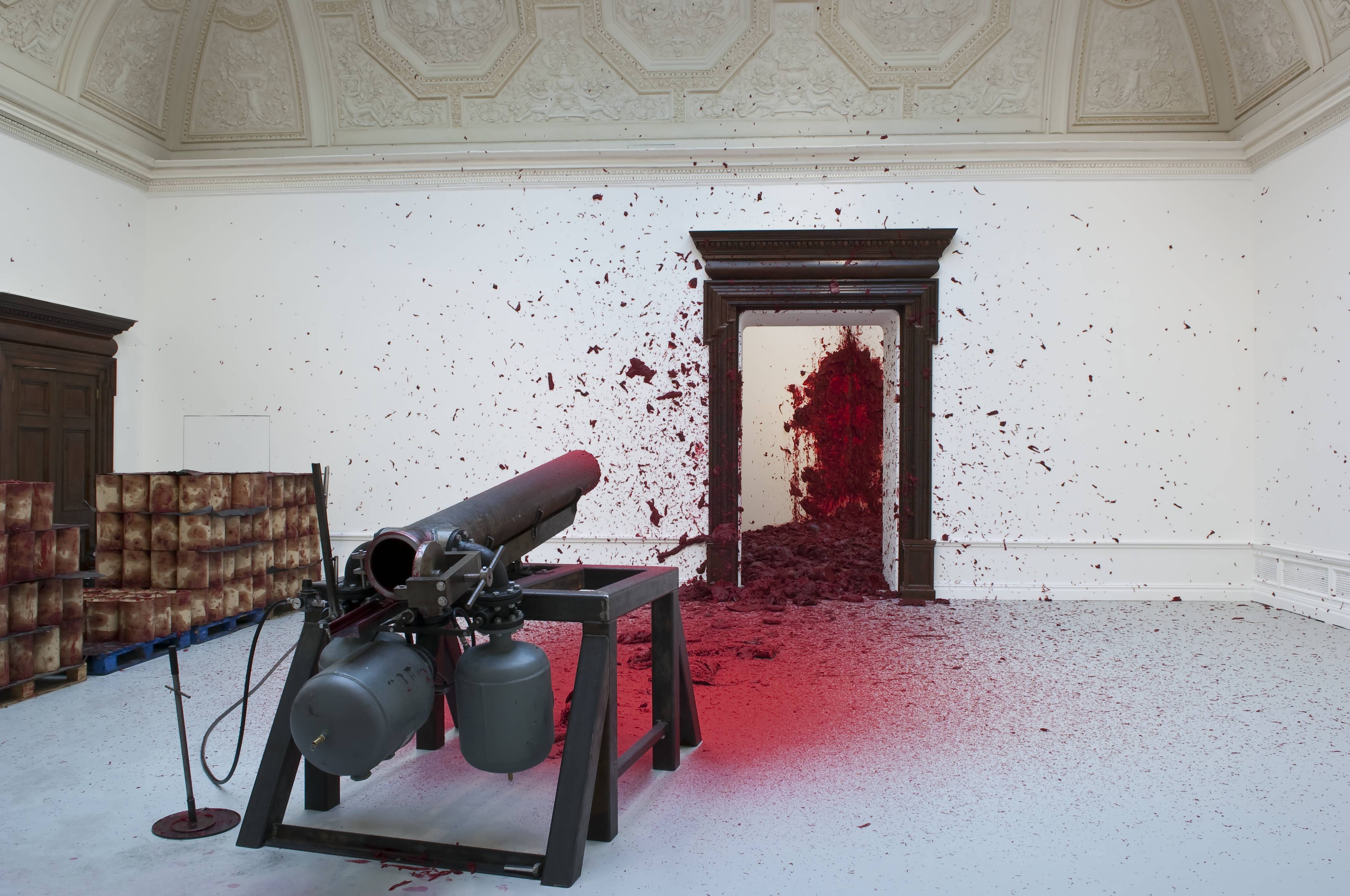 Under the glass roof of Berlin’s Martin Gropius Bau museum—which 70 years earlier was bombed and almost completely destroyed, and decades later stood on the outskirts of a barbed wire-laden and heavily guarded wall—a monumental mechanical and red wax installation topped by a big red circle captured the attention of an audience, eyes cast skywards. Anish Kapoor’s ‘Symphony for a Beloved Sun’ (2013) unfolded before viewers like a silent Wagnerian opera without the actors. A dramatic abstract carnage took place before the viewer, as wax pellets moved up one of several metal conveyor belts and then dropped onto the ground below, into a formless bloody wet mess saturating the floor with red—soft forms systematically disposed of