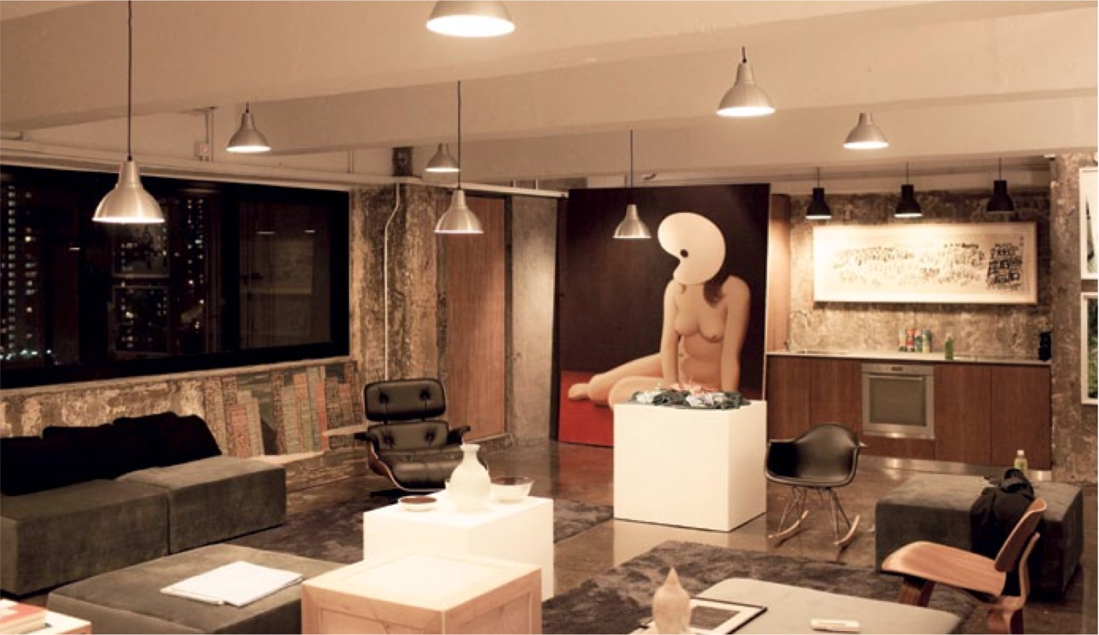 Large sacks of flour from the factory-scale bakery next door block the entrance of collector Alan Lau’s studio as I squeeze past. Part design den, part cool bachelor pad, the industrial space is bursting with art. A Lee Kit fabric work rests on a low table; on another surface sits a cluster of sculptor Liu Jianhua’s ‘blood’- filled celadon bowls, and a large Chow Chun Fai film-still painting with subtitles hangs in the background. Behind a dividing wall, a kinky looking life-size figure, titled ‘Play-20121109’, by Chinese firebrand Xu Zhen dangles from the ceiling.