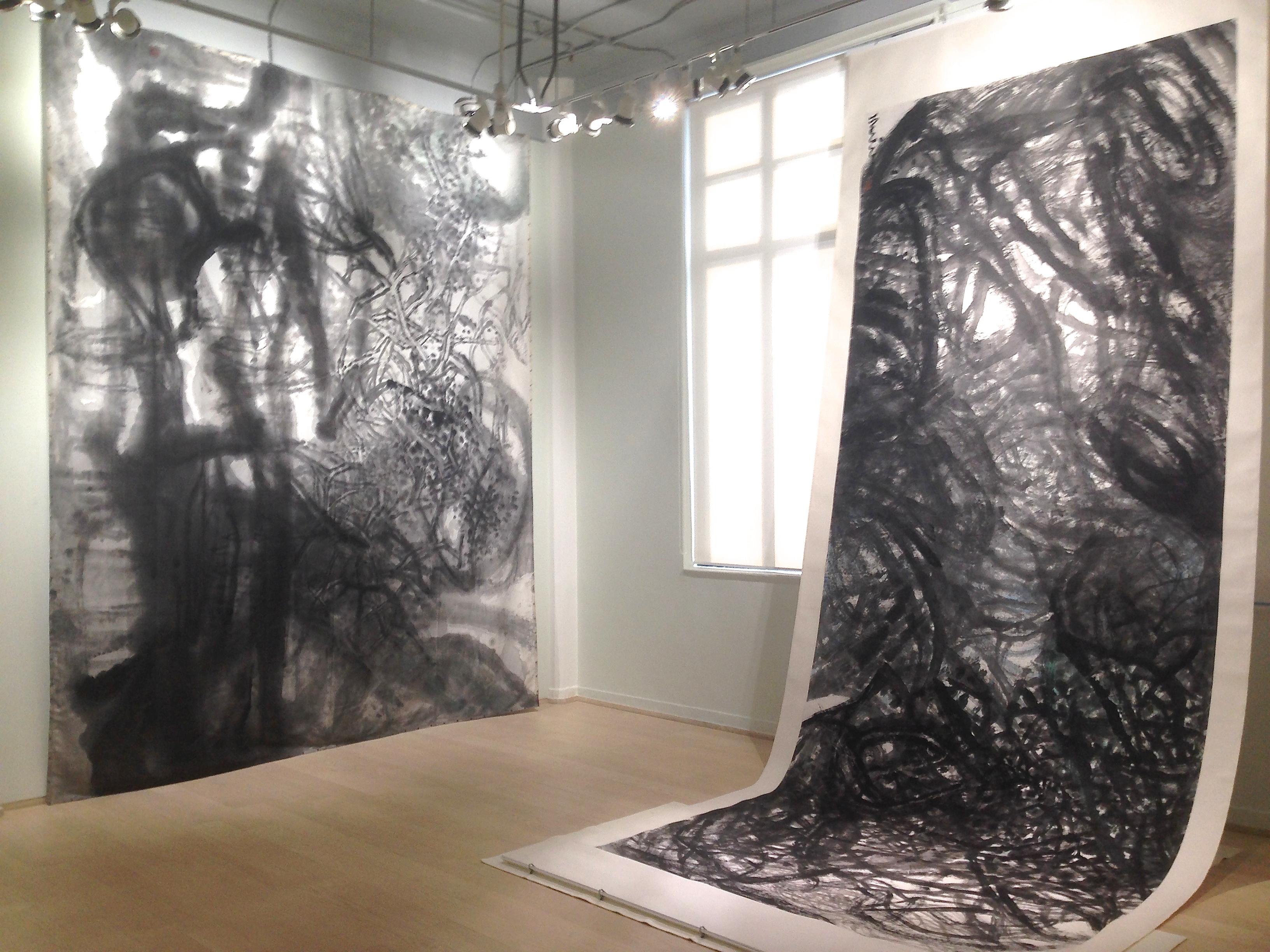 A large white cloth draped across one of the gallery’s central structural pillars creates a curtain of black calligraphy that captures the movement of cascading water as you step into the space. The first room is filled with six large works on paper, calligraphic black ink swirls, occasionally revealing a bruise of colour, give way to violent moody landscapes. While Aiqi is clearly a master of traditional Chinese ink brush painting, these works are also remarkably contemporary and abstract.