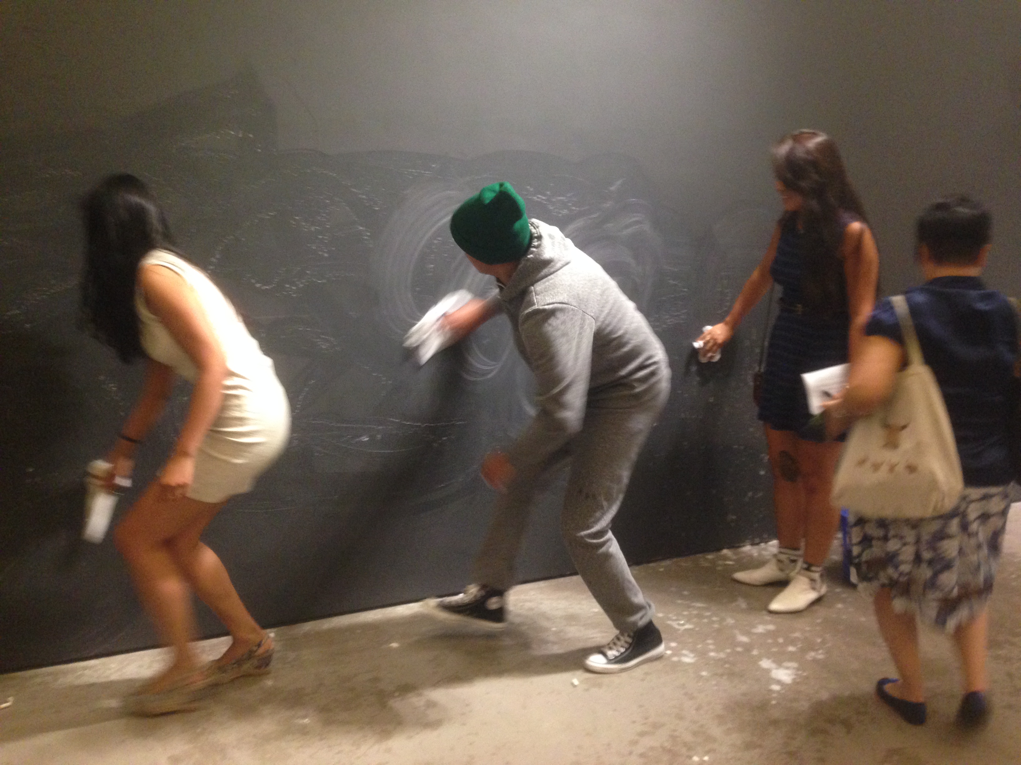 South African-born Berlin-based multi-disciplinary artist Robin Rhode is used to thinking on his feet, creating in challenging situations in Johannesburg. That certainly helped him with his Hong Kong solo show, where technical issues in the gallery resulted in the creation of last minute live performance for his opening. Rhode drew a white chalk outline of a car on the gallery’s grey painted wall, that with the help of audience participation, he proceeded to wash and polish. It was a tongue in cheek poke at the city’s fetishisation and conspicuous consumption of status-affirming luxury cars.