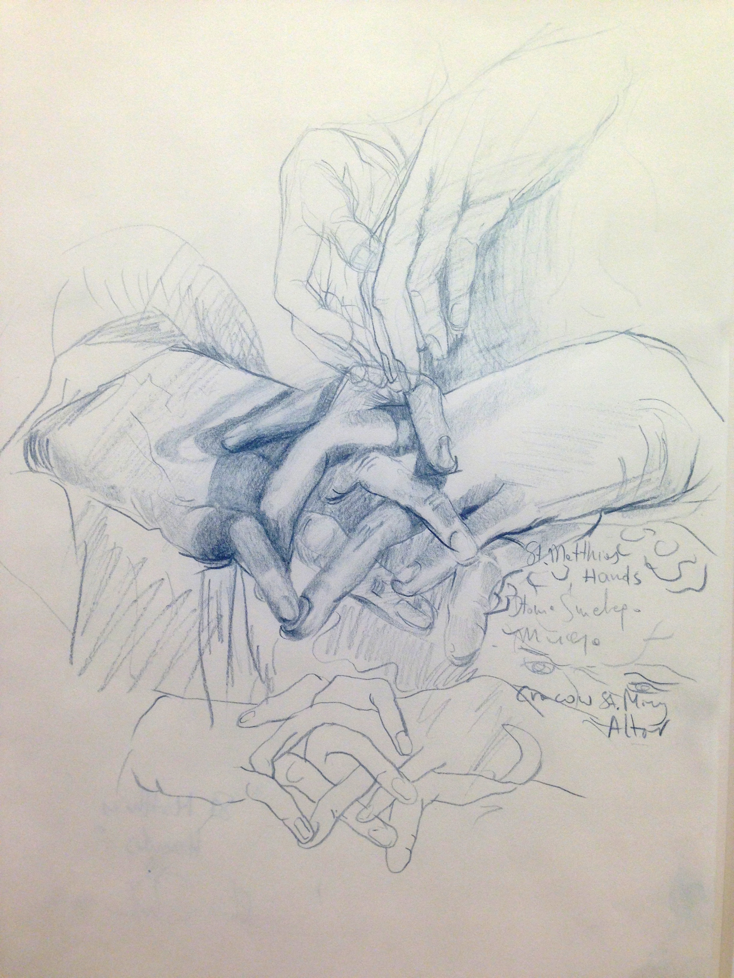 There is a heavy and folkish quality to Olowska’s ceramic pieces, roughly hewn, textured and so heavily glazed and tactile that it’s hard not to want to touch them. Her drawings, delicate inchoate sketches, have all the elegance of an Old Master; one study, three sets of saintly hands, fingers gracefully entwined in quiet repose, is utterly enchanting.