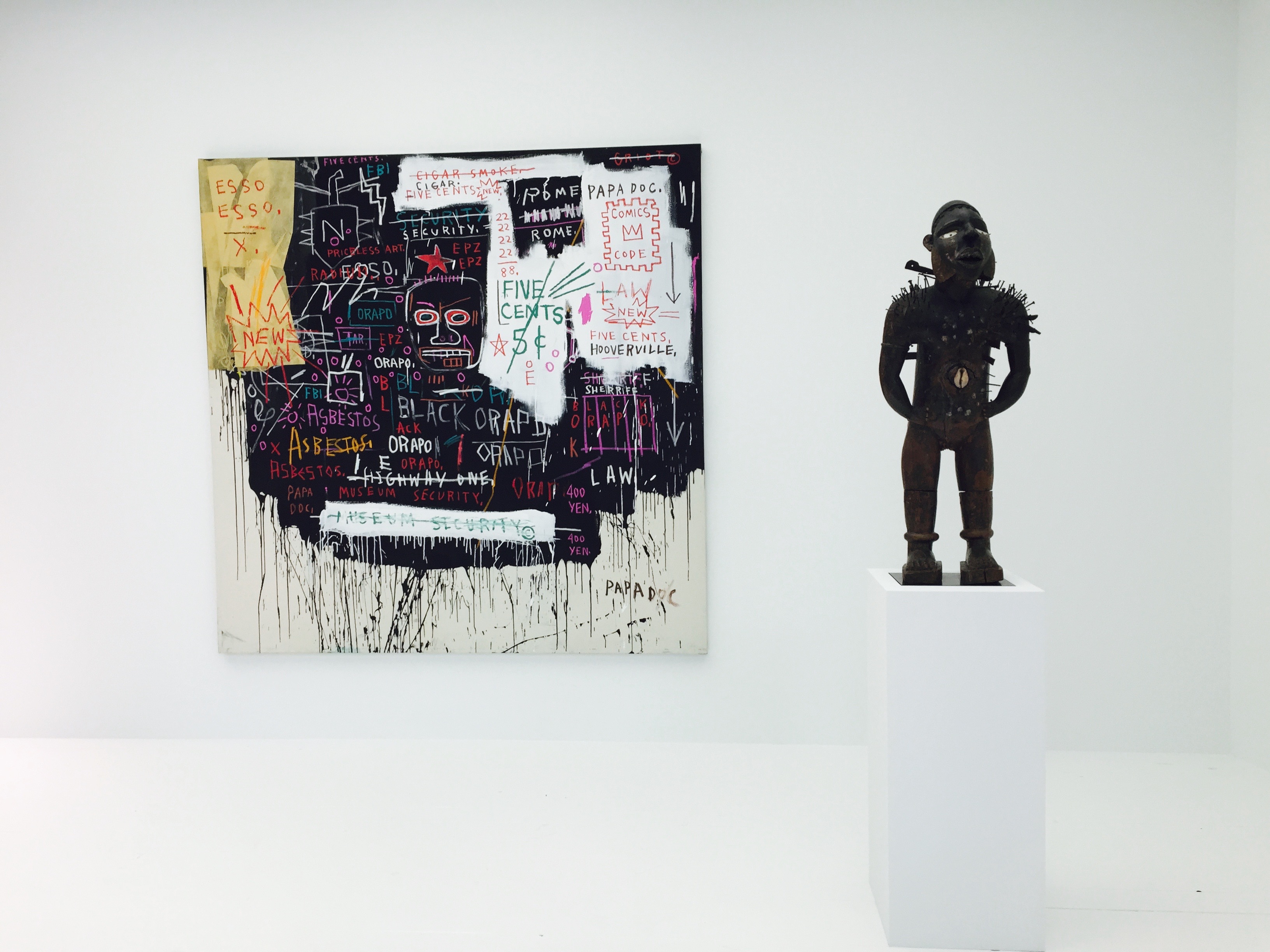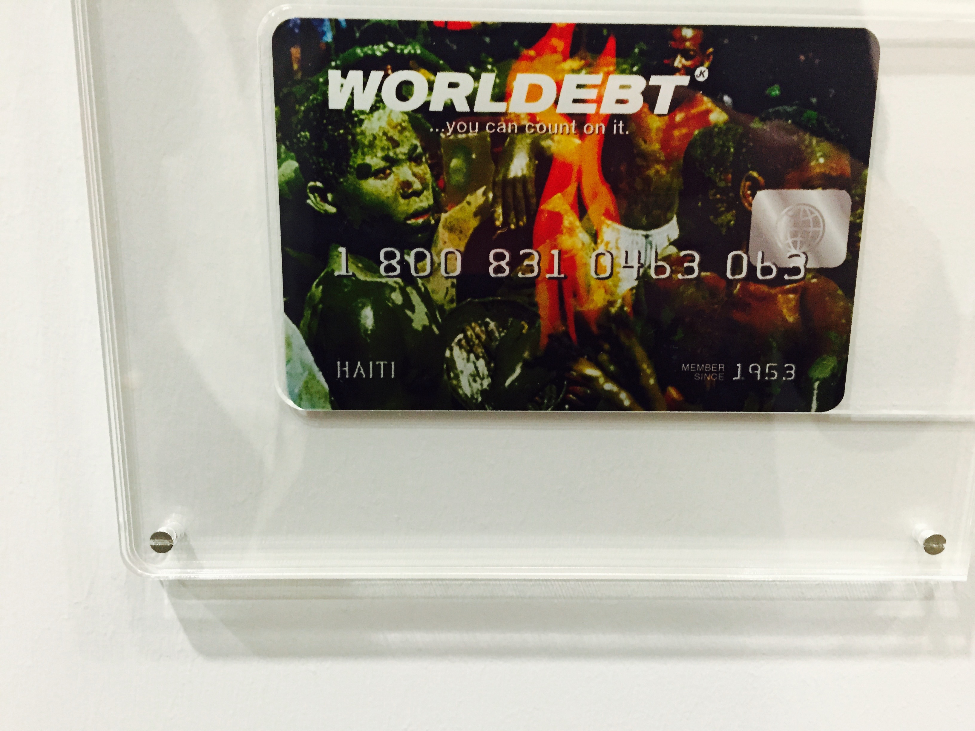There was art for our times with politically loaded works by Kader Attia and Tony Lewis. Attia engaged in a public performance of smashing his exhibited glass cabinets, the same as those destroyed in the Egyptian Museum during the 2011 Arab Spring, for his work Arab Spring (2014). Chicago-born Lewis presented a wall installation Never argue with police officers, address them as “officer” (2013) that hit home and got visitors talking about US race relations and the recent police related killings. Dotted about the exhibition space and wedged between the large multi million dollar installations were 165 oversized credit cards with the word ‘Worldebt’ printed on them—a card for each nation who had IMF intervention. The works, made by LA based artist John Knight in 1994 to commemorate the 50th anniversary of the International Monetary Fund and the World Bank, resonate as strong as ever today.