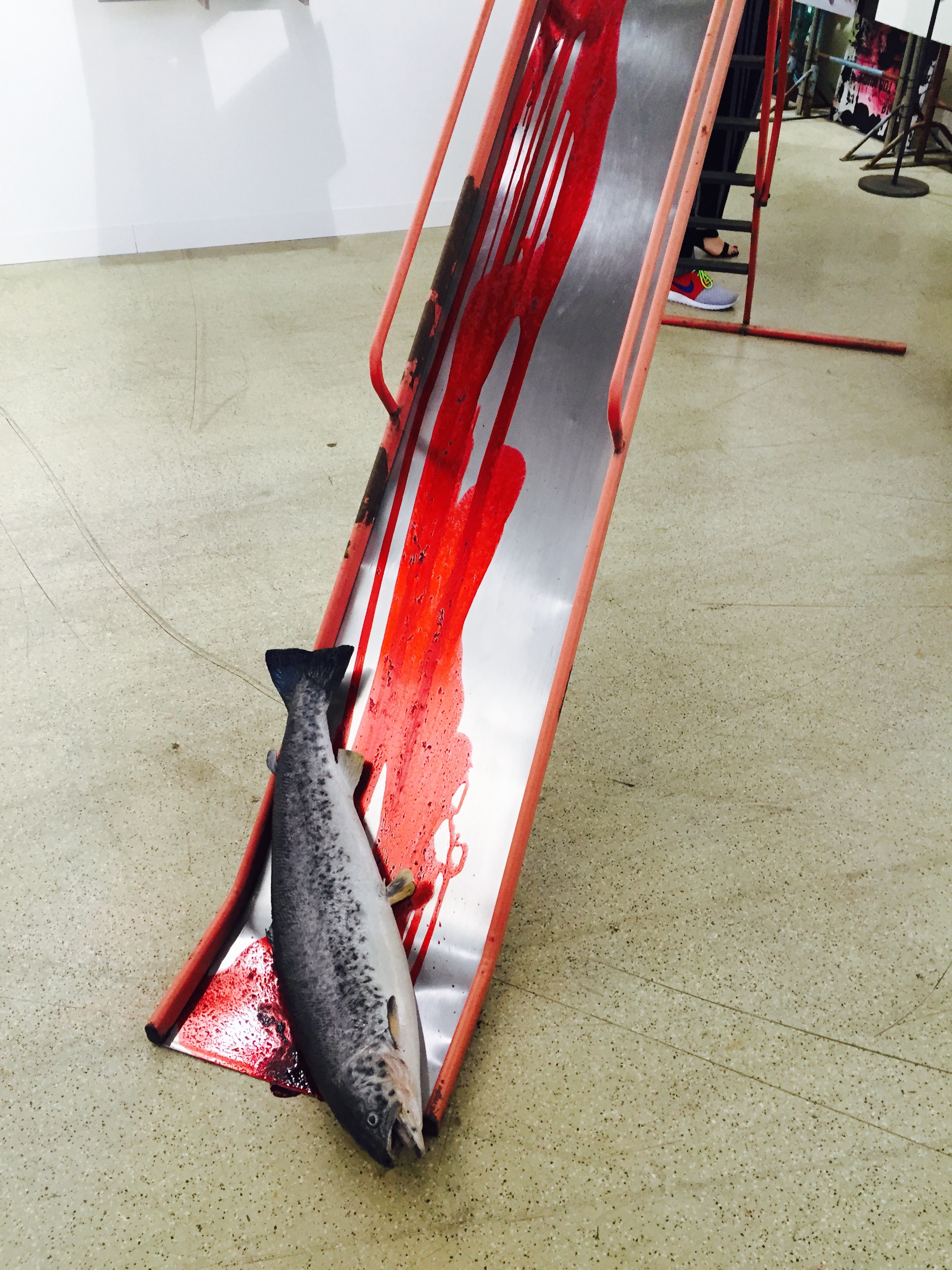 The Unlimited preview at Art Basel that evening felt a bit like a carnival. Spectacle reigned as it always does in this platform for large pieces and performance art. The beardy Berlin-based artist Julius von Bismarck took up residence in a spinning dish near the entrance of the exhibition hall where he would read, email, eat and sleep, for the duration of the fair. I heard that a liability clause had to be signed in the event of injury or ‘brain damage’. On a stage not far from von Bismarck, British musician Ghostpoet was performing a spoken word funk rock number for Gary Simmons’ Racapturing Memories of the Black Ark (2014). After the performance the speakers and staging was left in place as a reminder of the absence of the event.