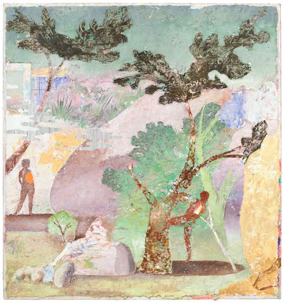 I was quite inspired by Roman frescoes. I’m always thinking about the human figure and trying to find a way to introduce it into my paintings. I feel very much disturbed when I try to introduce a figure—it’s always disappearing or I make it sculptural. In this case I had the feeling that I can treat the figure in a similar way to the way I treat a tree—it’s an object. Of course, if you see a figure it becomes a centre for the painting for the viewer. That’s unavoidable. But that’s why I wanted to look at these Roman frescoes where you have all these figures running around scenery, but I have the feeling they are not so important. They are merely one detail of the whole scene, but I am absolutely aware that we have here [pointing to painting] a little drama because we have two figures. When you have two figures in one painting you immediately have a drama. Something is going on It’s different to having two trees. So I’m really aware of this dimension of it becoming something different. This is a careful approach to this theme … it’s just one element; it’s an approach. I’m still always thinking about the figure—it’s always there in my mind—but I am circling around it.
