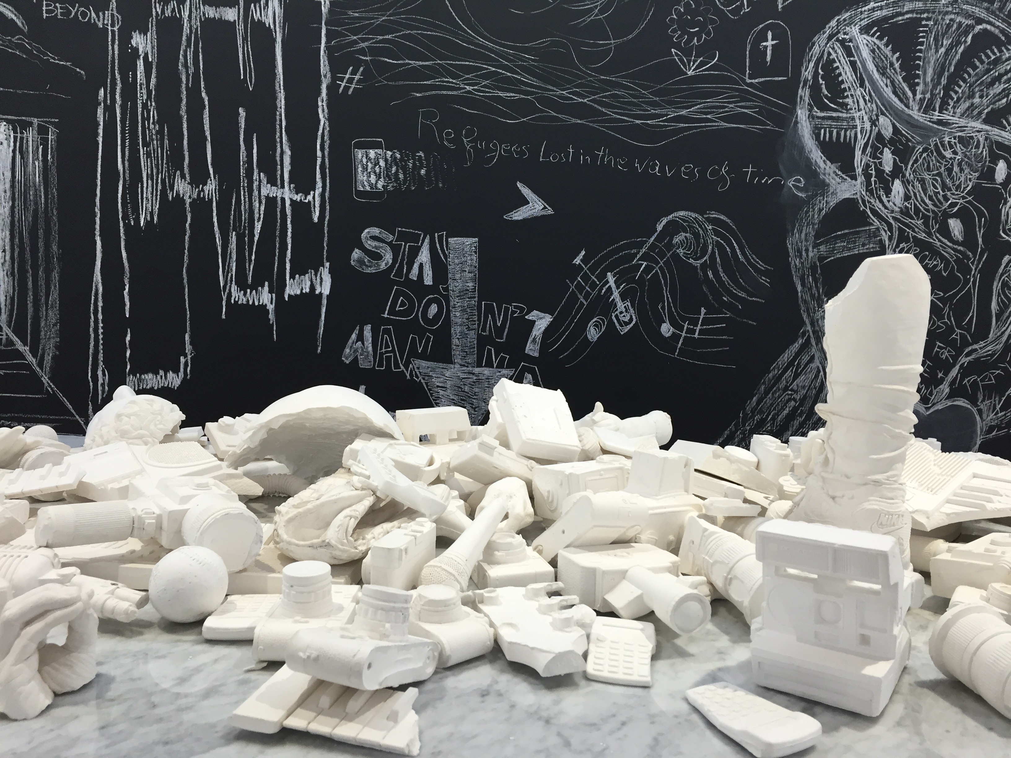 I think the work that engages the most is the work with the chalk. It’s a slightly different concept from the rest of the works but all of those pieces are constructed from chalk—they’re cameras and phones, microphones, and things really related to communication. Through the process of people coming in and writing on the wall, the pieces are destroyed. This idea of communication is transferred, but through that transference the works become dust, essentially.