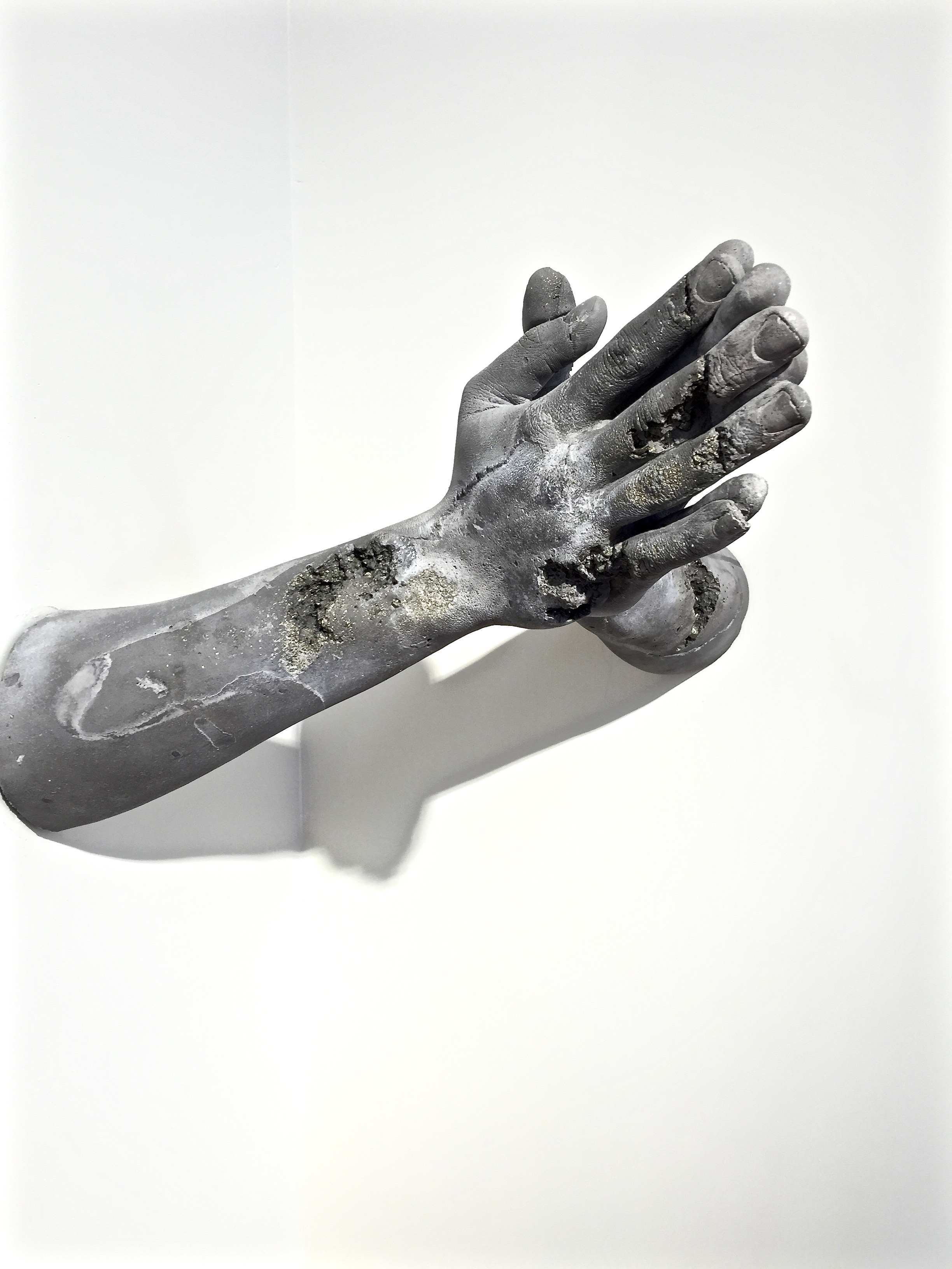 The space of Galerie Perrotin Hong Kong looks like it’s temporarily hosting the archeological preserved remains of Pompeii. Arms, hands, and bodies, in archetypal postures of classical sculptures, dissolve into, or emerge out of the wall. A figure sits in the middle of the gallery space crystallised halfway between falling down and standing up, frozen somewhere between destruction and reconstruction. A black wall stretched across the back of the gallery features white scribbles and doodles, resembling a classroom chalkboard sabotaged by the students. The work, titled ‘The Future Was Written’ (2015), is a participatory installation included as part of the exhibition. Composed of a marble pedestal laden with chalk fragments—hands, fingers, phones, radios—and a blackboard, visitors are encouraged to add their messages with the white chalk fragments. On the day I visit, bleak messages are scrawled across the chalkboard by students. It is quite fitting for an exhibition that on the surface appears dystopian.