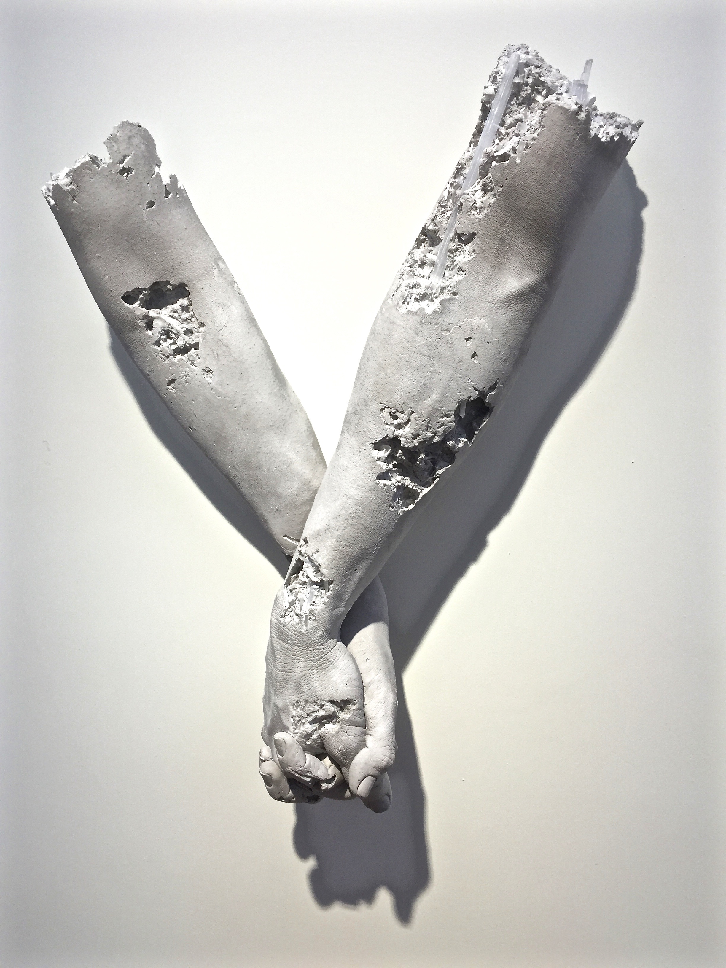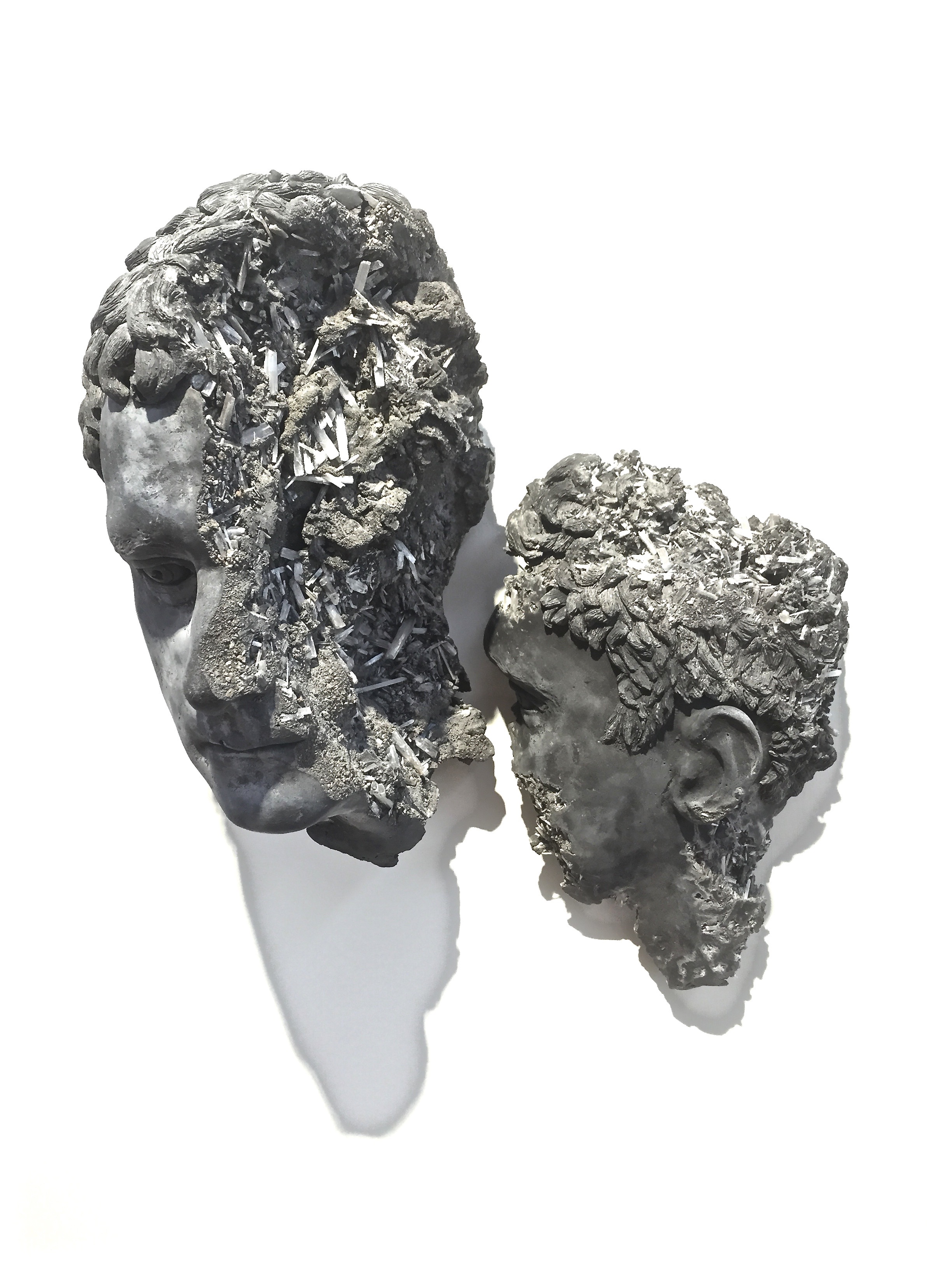 The figures are related to a couple of ideas. One is, there are these very famous figures from Pompeii that were calcified in ash, and, when we look at sculptures from antiquity it’s very rare that they find entire figures, right? There’ll be legs missing or arms missing. Often they’ll recompose those areas. Sometimes when you go to museums you’ll see a display underneath which shows the areas that were found and the areas that were reconstructed. So some of these works were made intentionally with areas missing. The crystal in them, and the idea of geological materials in them allows them to float somewhere between falling apart and growing on. You have the sense with the figures with the crystals in them that they almost could join at a certain point.