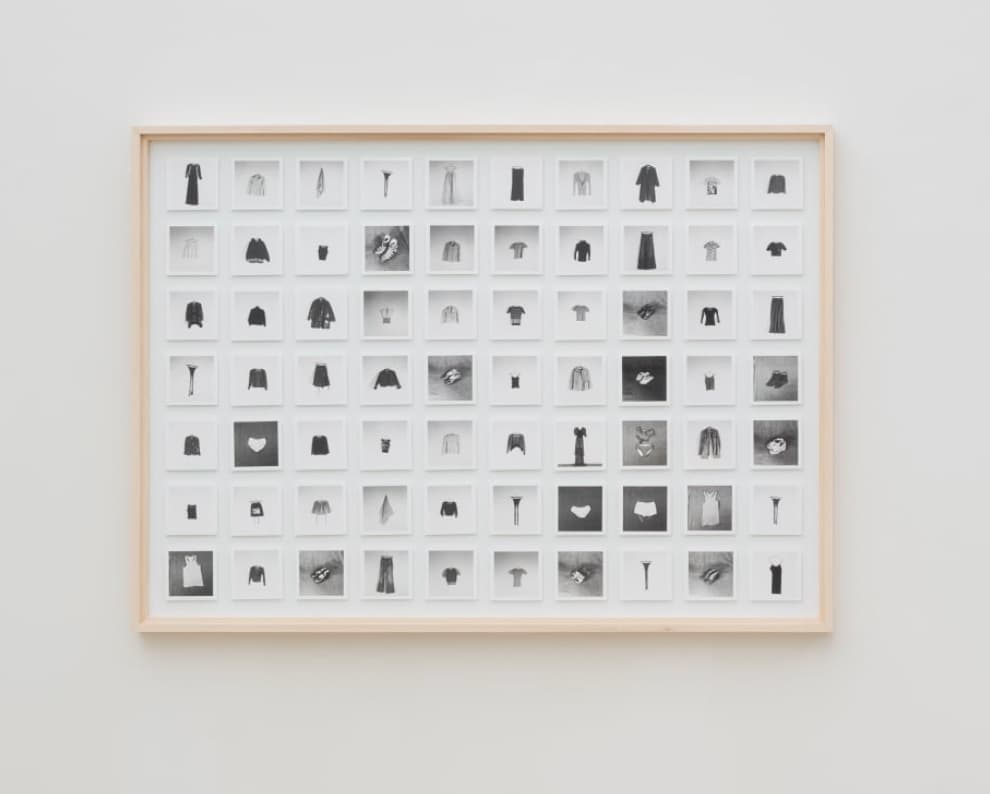 In one of the thirteen works featured in this exhibition, Feldmann brings together 70 individual black and white photographs of all the items of clothing from one woman’s wardrobe in ‘All the Clothes of a Woman’. The subject in question is represented in absentia, effectively making the work a portrait of a woman through her wardrobe alone. The work draws attention to the way capitalist culture fetishizes the attire of women, objectifying them through their dress and style, imbuing the objects with value. You are what you wear. But there’s also something fetishistic and voyeuristic about carefully laying out the clothes—knickers, bras, skirts, shirts— and photographing each one.