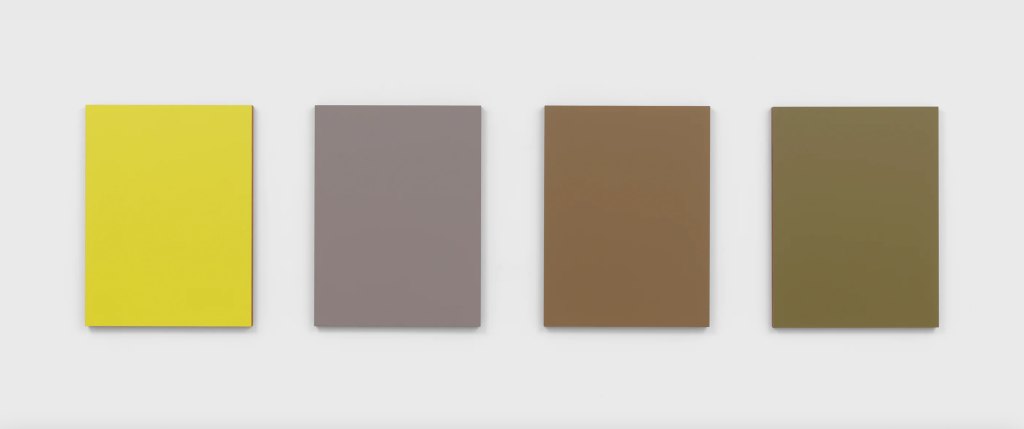 Across two exhibition rooms hangs Monochromes After Renoir Nudes (2016) a series of paintings that look like Pantone colour swatches, with individual panels painted in a monochrome colour value: dusty pinks, muted earth and olive green. This series, based on the female nude, a traditionally male subject, is an extreme abstraction or reduction of Renoir’s nudes to their simplest essence by using a chromatic computer algorithm to calculate each figure’s average colour, resulting in a monochrome panel. These nude paintings, once considered erotic, and still considered iconic, valuable, art fetish objects, in a commodity sense, have been reduced to nothing more than colour swatches.