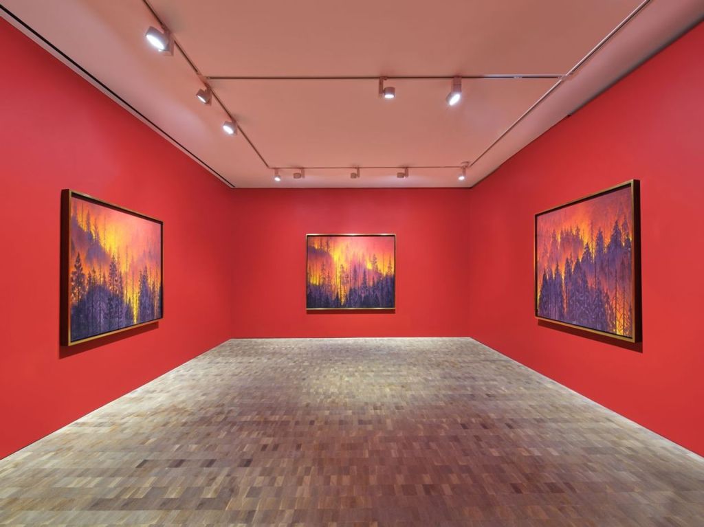 Yet, departing from Party’s distinctive style are three ‘Red Forest’ (2022) paintings, rendered more naturalistically in the third and final crimson room. Each depicts a forest on fire—with silhouettes of ashen trees standing against a blaze of reds, yellows, and oranges—and bring to mind the images of wildfires that are cropping up with increasingly ominous regularity around the world.