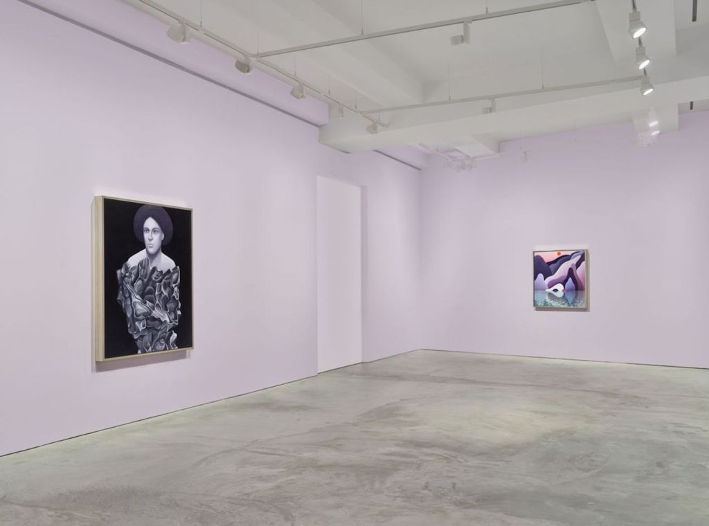 Hanging in the first lavender-painted room are four landscapes and two large portraits that appear genderless, with features recalling classical Greek or Pre-Raphaelite portraiture. Their unnaturally coloured skin is either the same, or complementary to the monochromatic backgrounds. Similar features are depicted across each—a round puffball of hair, wide almond eyes, defined noses and thin lips, and softly smudged contours.