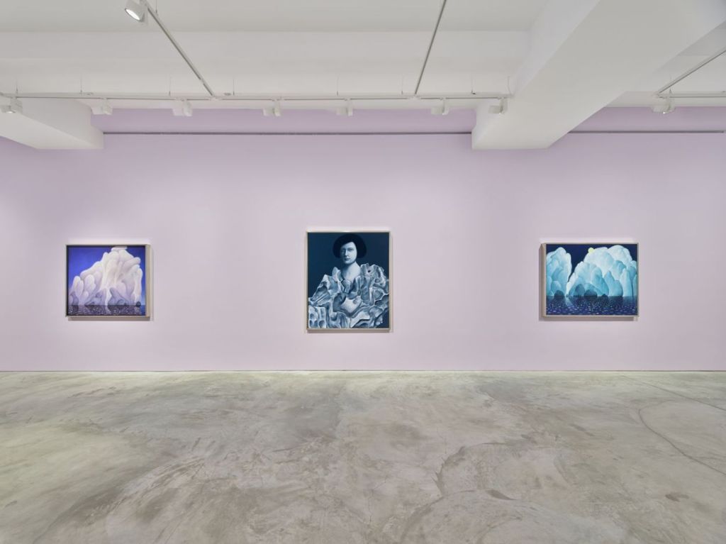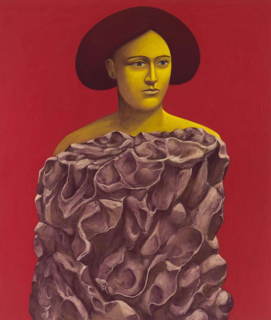 As with the artist’s previous hybrid portraits of torsos emerging from animals and plants that evoke humanity’s dependency on nature. Two portraits rendered in grisaille lend their figures an otherworldly quality, their soft lavender-grey skin against a black background; another is a yellow figure against red. Their torsos appear to be consumed by meteorite clusters, or hemmed in a particularly uncomfortable, avant-garde bodice.