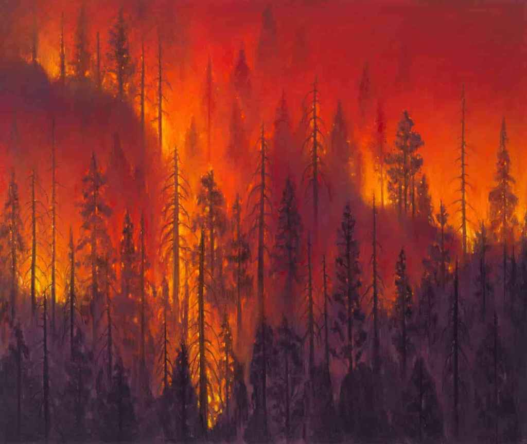 Unlike his stylised landscapes, these red forest visions illustrate the impact of human activity on the environment, offering no escape into imagination. We can only indulge in fantasy for so long amid the inescapable reality of climate catastrophe.