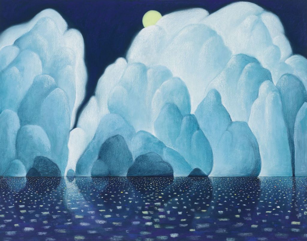 Like the portraits, Party’s landscapes conjure fantastical scenes. They are untouched and devoid of humans; unnaturally dreamy and abstracted. Works from the ‘Water Reflection’ series (2022) are Willy Wonka-esque, with psychedelic mountains resembling soft layers of marshmallow clouds and scoops of ice cream, and ripples of water almost vibrating.