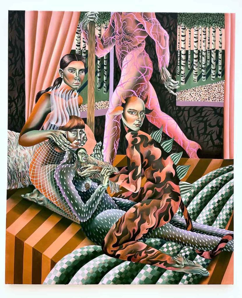 Makinson’s composition recalls religious Renaissance paintings, but rather than virtue the artist unleashes an erotic force; a manifestation of the psyche, where dreams and nightmares reside in an atmosphere of fear, fantasy, anxiety, and desire.