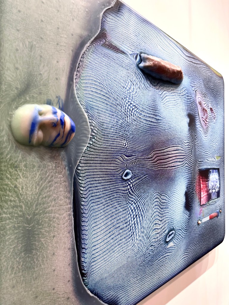 Born in the ’50s Hsu’s work was ahead of its time. Futuristic, mixed-media paintings and sculptures merge machine and man: silicone faces and body parts protrude from the surfaces of silkscreen-printed, textured canvases which are striated and rippled with pigment, resembling flickering liquid screens. The work was post-internet before the internet saturated global society—gluing us to screens the world over— and before the term was even coined.