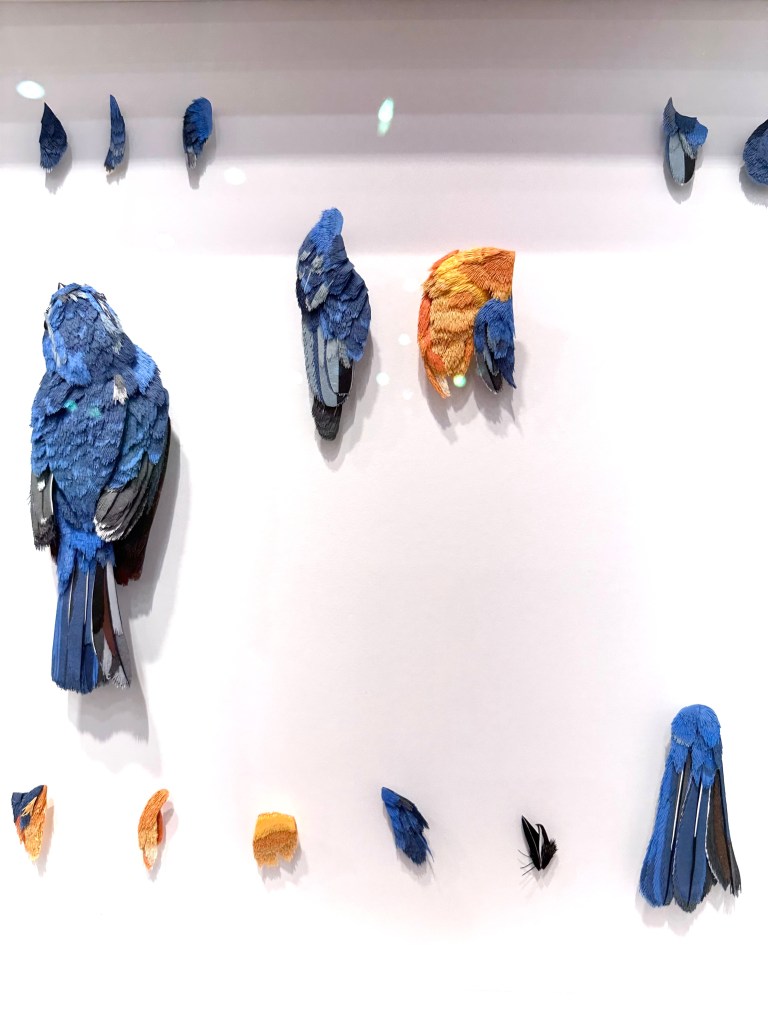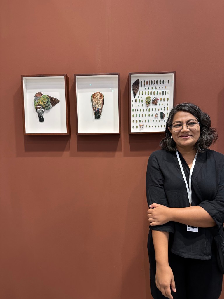 At Mumbai-based Tarq Gallery, a Wunderkammer presentation of deconstructed Lepidoptera and birds by young artist, Nibha Sikander (who was present to chat with visitors about her work), hung from the booth walls in framed glass cases. Made from layers of coloured paper and exquisitely detailed to resemble butterflies, moths, insects and birds from her hometown, their deconstructed forms resembled colourful intricate abstract paintings.