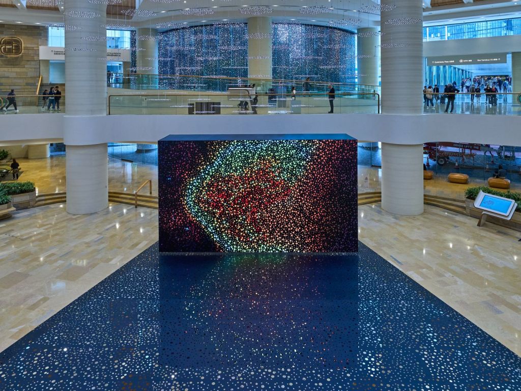 Not for the trypophobic, the wraparound black window treatment is perforated with the artist’s signature holes, playing on the movement of light throughout the day. Seen from outside at night, as the mall lights glow through the perforated window, the work resembles a constellation set against Hong Kong’s urban concrete jungle.